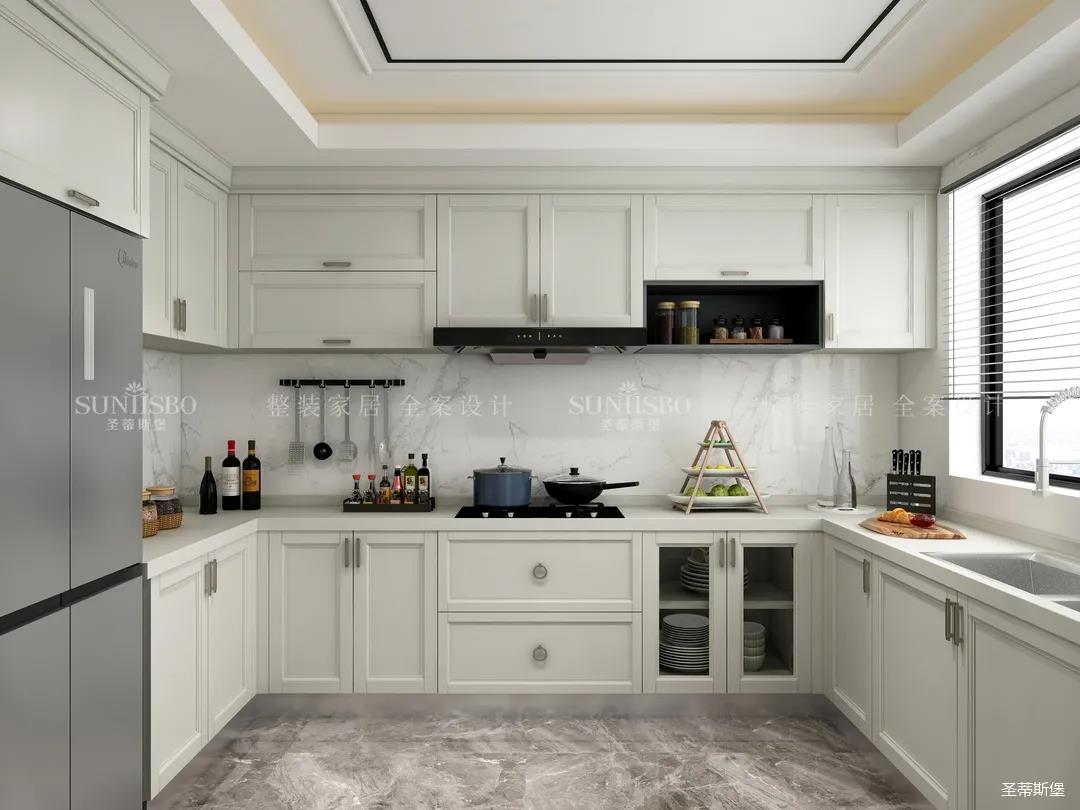 厨房从屋主的饮食习惯出发,运用温柔的莫兰迪色彩(仿古白)打开了美式橱柜定制的新世界!在美式轻奢的基调上,进行线面模块的灵活组合,在满足厨房基本需求的同时也将储物优势传达到每一细节处。